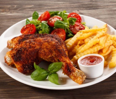 Grilled Quarter chicken with potato chips and salads